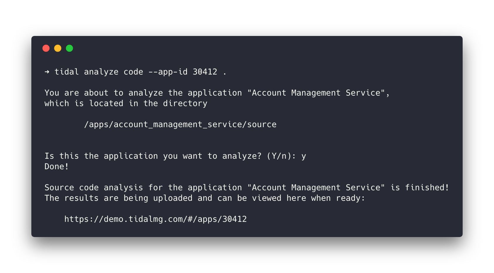 tidal analyze code upload [file_name] --app-id [app_id_for_your_application]`You should receive confirmation that the upload has been completed and can navigate to Tidal Accelerator to see the results.
