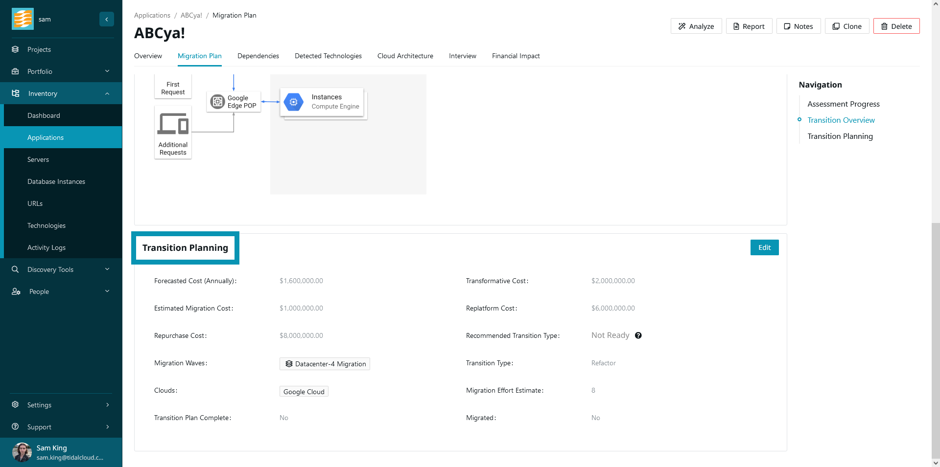 Arguably the most important data you’ll be dealing with is the current cost and cloud cost for your apps. For the most part, ‘cloud costs’ refers to rehost costs, however we do allow you to visualize and compare ROIs for alternative cloud migration transition types. More on that later.