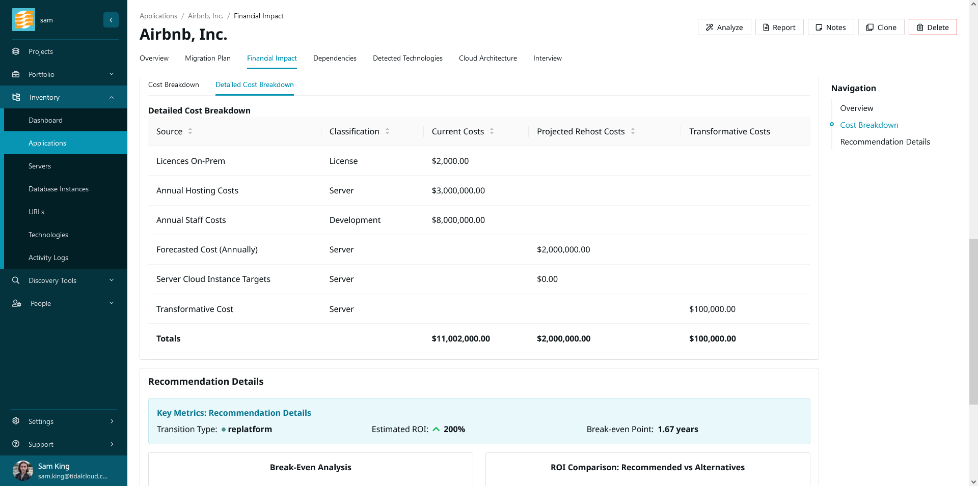 Part of building your cloud migration business case is comparing and contrasting different 6R approaches to cloud migration. Tidal Accelerator’s financial impact report includes a visual comparing the ROI of different possible migration strategies (also known as transition types). This can be found in the application drill-down under ‘Recommendation Details’. To populate this, on the application record under ‘Alternative Transition Estimates’ you will find the following possible fields; ‘Repurchase Cost’, ‘Replatform Cost’, ‘Rehost Cost’, and ‘Transformative Cost’.